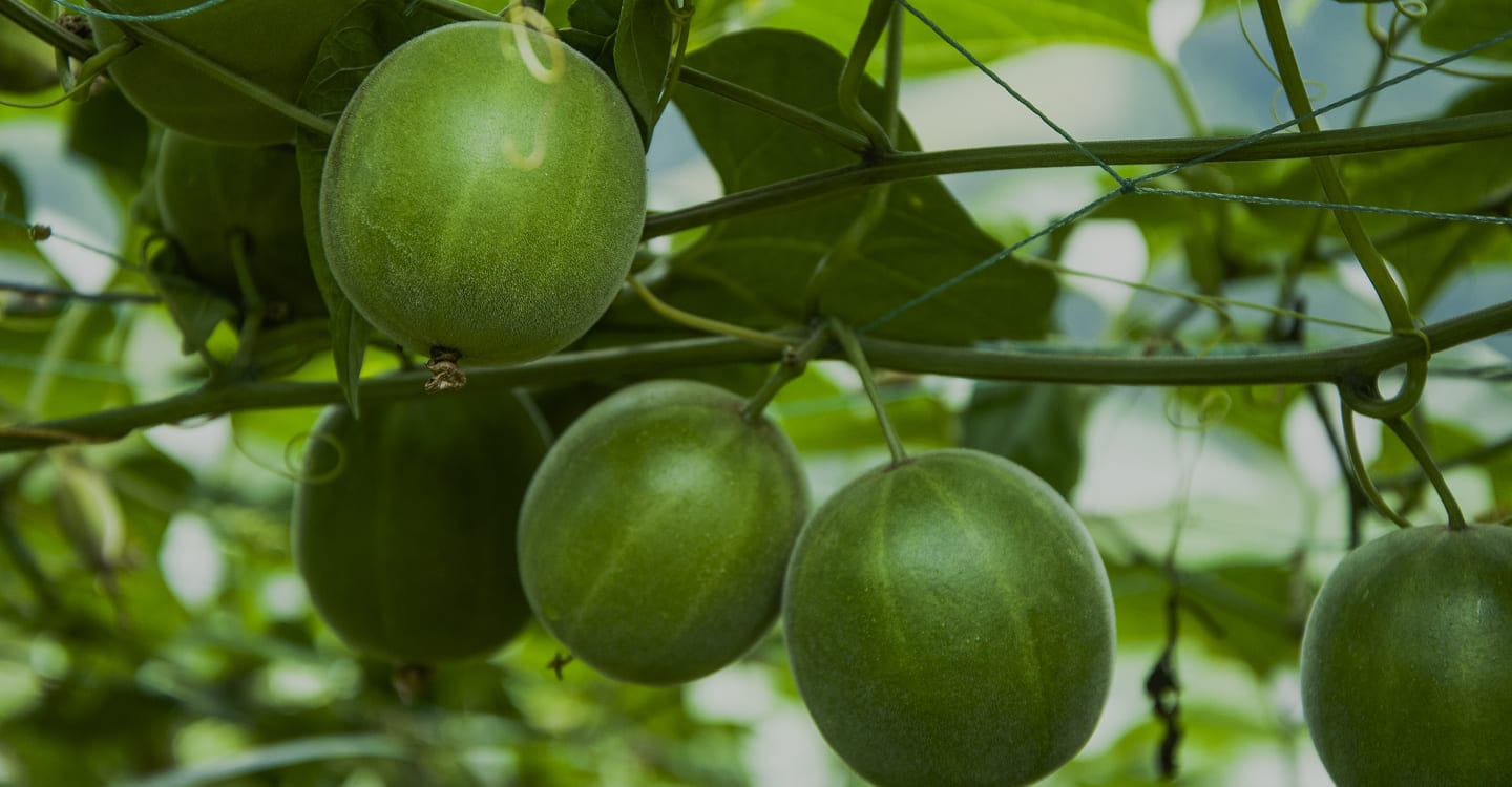 Monk fruits are harvested from their vines and gathered to be crushed.